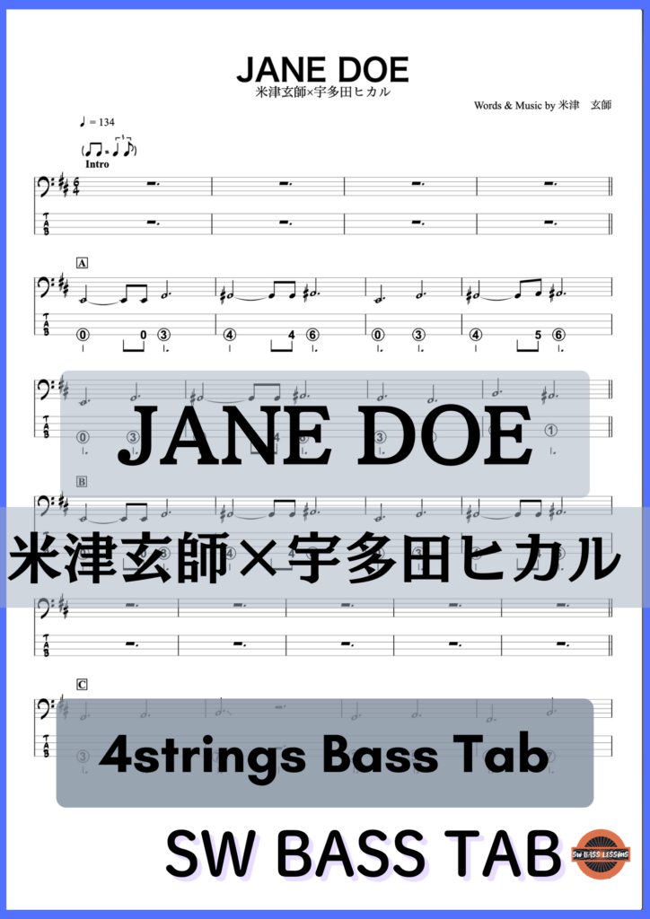 【JANE DOE】米津玄師, 宇多田ヒカル『ベースTAB譜』☆4弦ベース対応