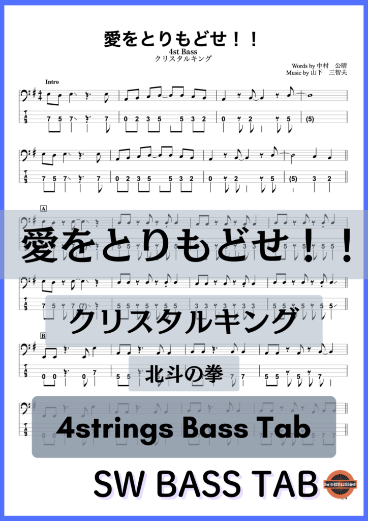 【愛をとりもどせ!!】「北斗の拳」クリスタルキング『ベースTAB譜』☆4弦ベース対応