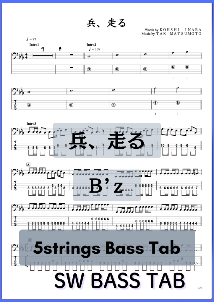 - B’zさんの【兵、走る】の☆5弦ベース対応『ベースTAB譜』です!